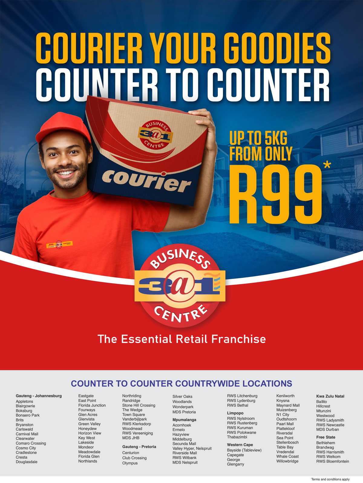 We offer 3 courier services to suit your needs – Local Same Day, Overnight Courier and Economy Road services From as little as R99.00 (T&C’s apply). We also provide international courier with DHL EXPRESS